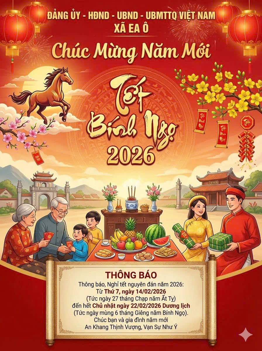 Triển khai Công văn số 06444/UBND-NV, ngày 23/10/2025 của Ủy ban nhân dân tỉnh Đắk Lắk về việc nghỉ tết Âm lịch, nghỉ lễ Quốc Khánh năm 2026; UBND xã Ea Ô thông báo như sau:
