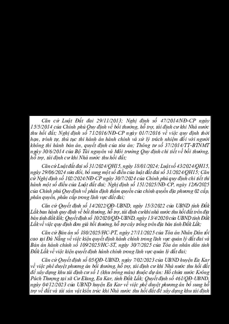 | Tiêu đề văn bản | QUYẾT ĐỊNH Về việc phê duyệt phương án bồi thường, hỗ trợ, tái định cư khi Nhà nước thu hồi đất để xây dựng Khu tái định cư số 1 (khu trồng màu) thuộc dự án: Hồ chứa nước Krông Pách Thượng tại xã Ea Ô, tỉnh Đắk Lắk - hộ ông Nông Văn Cương) | ||